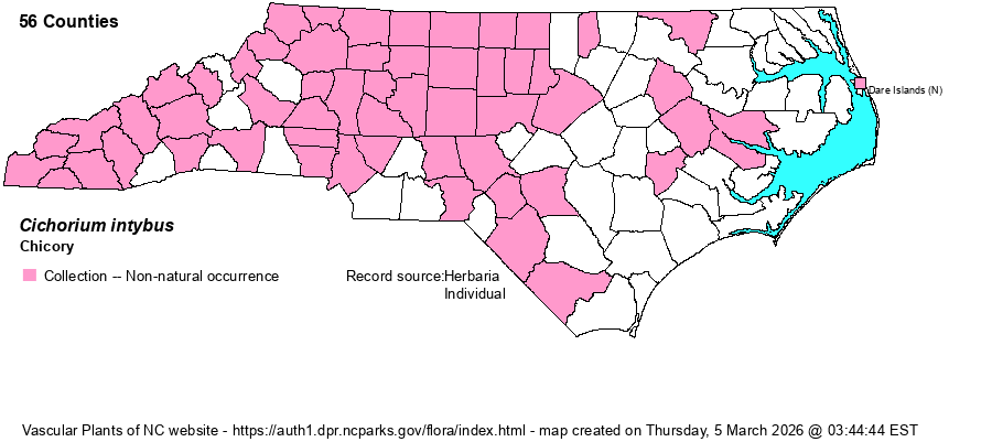| Identification | Chicory is easily recognizable by its light blue to lavender-blue flower heads about 1.5-2 inches across and composed only of ray florets. The species is quite familiar to people in the western and central parts of the state, though not so nearer to the coast. | |