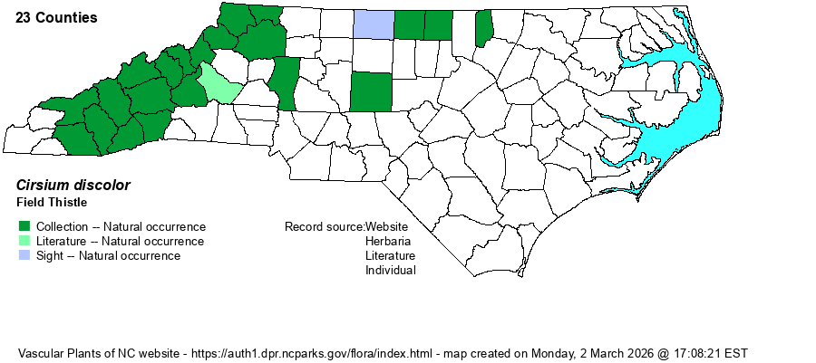 | Identification | This is a tall thistle quite similar to Tall Thistle (C. altissimum) in general appearance; it often reaches 4-6 feet tall. The purple-pink heads are numerous and rather large, about 25-35 mm high, as with that species. It can be separated from that species by its deeply dissected leaves, cut almost to the midrib. Swamp Thistle (C. muticum) is also a tall species with dissected leaves, but the spines on the involucre bracts are extremely short or lacking, but these bracts are quite sticky, whereas the bracts are spiny (over 1 mm long) and not sticky in C. discolor. | |