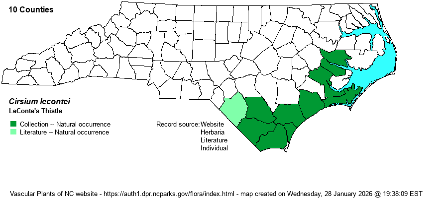 | Identification | These plants grow 2-3 feet tall, with only 1-3 pink to red-purple heads. The clinching character, when present, is that the leaf bases run down the stem as narrow "wings" (the only other NC thistle that does so is the alien C. vulgare). However, not all plants show this character; and so LeConte's Thistle closely resembles Sandhill Thistle (C. repandum) and Pasture Thistle (C. pumilum). From the first it differs in having fewer heads and longer flower stalks (5-30 cm long vs. 0-2 cm long); and from the second by shorter florets (25-45 mm vs. 45-55 mm) and restriction to the Coastal Plain. It is easily separated from C. nuttallii, very rare in the state, as that species has many branches and thus inflorescences, typically grows far above 3 feet tall (often 6-9 feet tall), the heads are rather small, and the heads are often white to pink (and not all pink). This species has an odd look for a thistle, being quite narrow and "straight-looking", with a very long flower stalk and often just a single head per plant. | |
