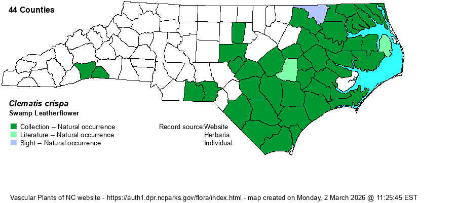 | Identification | This is an herbaceous vine, typically climbing to about 6-8 feet long, with some branches. It has numerous opposite leaves, each pinnately divided into 3 or 5 leaflets, each one with entire margins. Not only are the leaves on petioles 1-2 inches long, but each leaflet is on a stalk up to 1 inch long. The entire margins separate this from C. virginiana, but the non-native C. terniflora, as well as the native C. viorna, also have entire margins to the leaflets. You may need to wait until flowers are present, as these three have completely different flowers. C. crispa and C. viorna have solitary flowers at the ends of each branch; the first has thick light blue to lavender-blue flowers (about 1-1.5 inches long) with strongly curved sepal tips to look like a flared bell; C. viorna has thick but urn-shaped flowers that are purplish-rose. The exotic species has thin, spread white flowers in clusters, very similar to those of C. catesbyana and C. virginiana. All of these species have "curly-head" fruit, composed of seeds (achenes) attached to feathery stalks. When walking along Coastal Plain bottomland openings, such as along a greenway, you likely will encounter this leatherflower fairly often. Thankfully, it has a long flowering period, and thus hopefully you will catch some of these vines in bloom, just to be sure it isn't the non-native one! | |