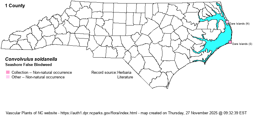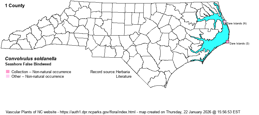 | Distribution | As far as is known, there is only a single specimen from NC: sand flat just behind low dune, Cape Hatteras Point, Dare County, collected in 2013 by B. Sorrie. There are sight records of plants to the north at Jockey's Ridge SP, Pea Island National Wildlife Refuge, and "near Kitty Hawk." The NC and VA records are far disjunct from any others and therefore difficult to interpret their native vs. alien status. NC populations are highly erratic in when they appear, skipping many years between. Taxon editors suggest that they are likely to be alien waifs that arrive via storms and hurricanes.