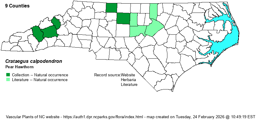| Taxonomic Comments | This is one of the few NC hawthorns that were included as a good species in RAB (1968). A few old references do list several varieties for it.