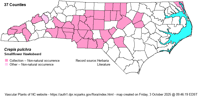 Identification | Smallflower Hawksbeard most resembles C. capillaris, but the stems have stipitate glands (vs. not stipitate in that species). It has numerous rather small Common Dandelion (Taraxacum officinale) type heads at the ends of many branches, well above the leafy stem. | |