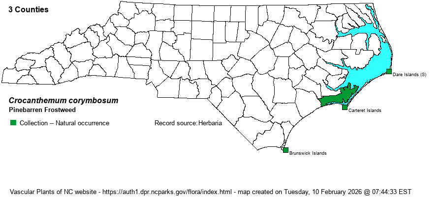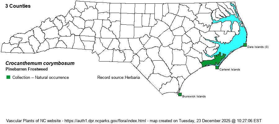| Abundance | Very rare, with only three of the seven known locations still considered extant by the NCNHP. This is, certainly, much rarer than the other coastal Crocanthemum -- C. georgianum. Further showing its scarcity is that there are no photos on iNaturalist, as of May 2025. This is a State Threatened species. | |