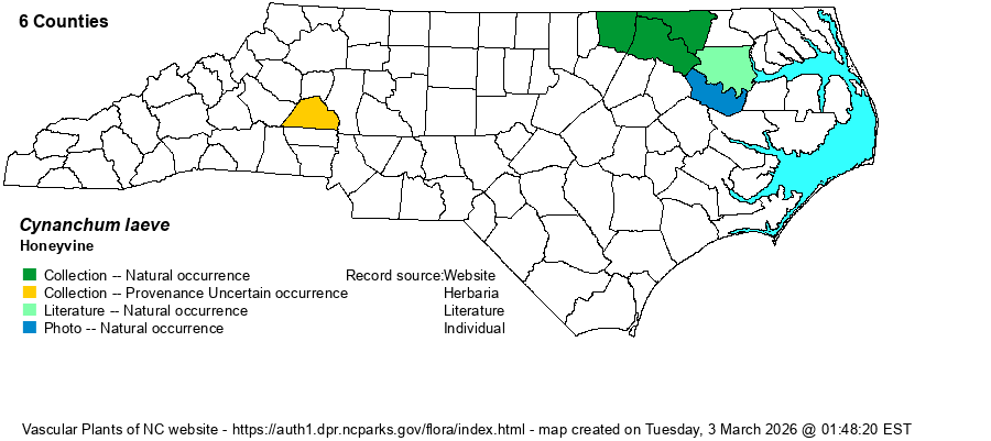 | Taxonomic Comments | Though RAB (1968) has it named as Cynanchum laeve, as does Weakley (2018), it has gone by Ampelamus albidus in some references.