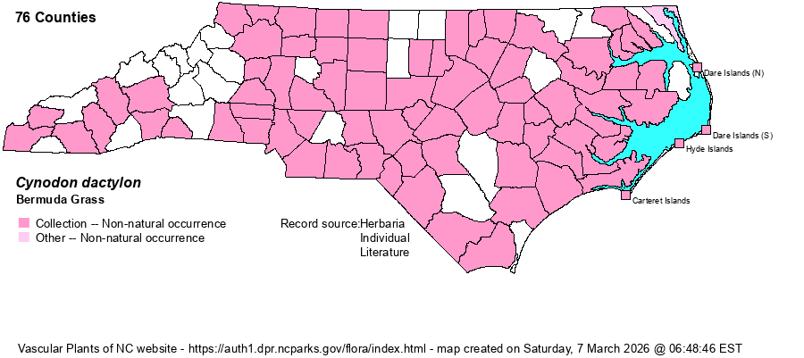 | Account for Bermuda Grass - Cynodon dactylon (L.) Persoon | Only member of Cynodon in NC. | |||||||||