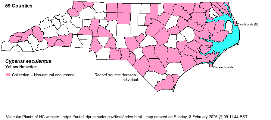 The genus Cyperus is mostly tropical and warm-temperate in distribution; thus, in NC it is much commoner in the Coastal Plain than in the Mountains and Piedmont. Most species have 1-few flowering stems (culms) from grasslike basal leaves, plus a few stem leaves. At the summit is an inflorescence of very open and branched, or tightly packed, spikes, varying among species from brown to golden brown to straw-color to reddish. The arrangement of the spikelets is important, whether like a hand (digitate) or in paired or alternate rows (pinnate); as is the shape of the achene (seed), whether bi-convex in cross-section or triangular. As a group, Cyperus tends to be weedy and readily enters disturbed ground; this is true for many natives as well as all the aliens. In recent years, following DNA research, the genus has incorporated several genera that in RAB (1968) or other manuals were separate: Hemicarpha, Lipocarpha, and Kyllinga. | |