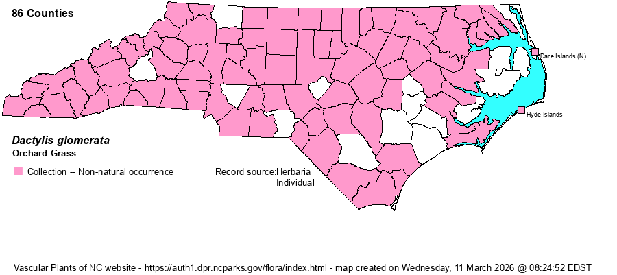 | Identification | Orchard Grass is probably familiar to most folks, with its stems 2-4 feet tall (perhaps more) and branched inflorescence with many dense, oval spikelets. The lower inflorescence branches spread widely, the upper are generally appressed. The spikelets are rather compressed laterally. | |