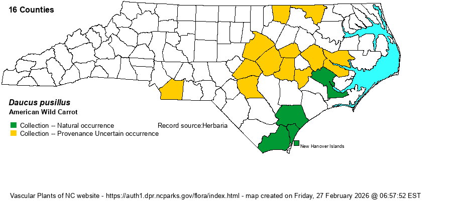 | Identification | This is a rather slender species that might be passed over as a smaller version of the abundant exotic Queen-Anne's-lace (D. carota). It grows to about 1.5-2 feet tall, usually unbranched. The scattered stem leaves -- about 4 inches long -- are generally ovate in shape, highly dissected twice, into lacy, fern-like segments, with the smallest segments barely 1/10-inch wide. The terminal umbel, and any side umbels, are flat-topped, with numerous rays, creating an umbel only about 2-2.5 inches across, noticeably smaller than that of D. carota, which has umbels about 4-5 inches across and often domed. Also, photos show large leaf-like bracts extending beyond the umbel. In the exotic species, the central flower in each umbel may be dark red to maroon, whereas as in the native species this flower and all others are white. (Some populations of D. carota lack such maroon central flowers, so absence of such flowers is not a useful character.) Also, the longest rays in an umbel in the exotic species are generally more than 3 cm long, whereas D. pusillus has rays shorter than 3 cm. No large bracts appear below the umbel. The most distinctive feature is the fruit -- this species has long barbs/spines, and thus the inflorescence at that season looks like it contains many small "cockleburs"; the abundant D. carota in fruit has the involucral bracts not obviously spiny. It is not clear if biologists 1) are searching but simply are no longer finding much of this species in recent decades, 2) are finding it in numbers but not collecting it anymore, or 3) are simply not paying attention to any Daucus for the reason that it is probably "just" the exotic species. | |
