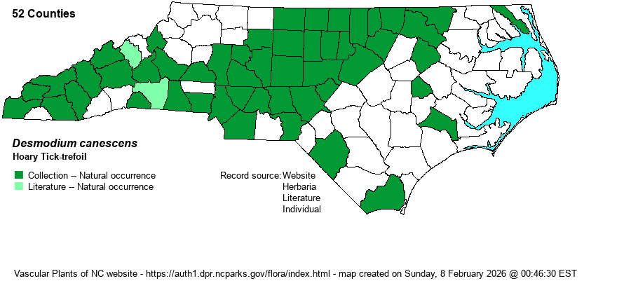 | Identification | This is probably the "bushiest" of the state's many Desmodium species. Even though it is herbaceous like the others, it often grows to about 3 feet tall (occasionally to 4 feet tall) and typically wider, with numerous wide-spreading branches. It has finely-hairy branches and stems, often also a bit sticky (glandular). The leaves are rather typical for the genus, being trifoliate, with the central leaflet being ovate and reaching 3 inches long, with the lateral ones also ovate but around 2 inches long. Quite noticeable is that the flowers usually turn greenish-blue in late bloom; the racemes of numerous (and larger than in most others in the genus) rosy-pink flowers tip the many branches. Thus, the species is normally not hard to identify, by 1) its very bushy look (often wider than long), 2) quite hairy stems and leaf petioles, and 3) flowers that turn greenish-blue in later stages. It should not be too hard to find in typical settings in most of the Piedmont or southern mountains -- woodland borders and other edge habitats. | |