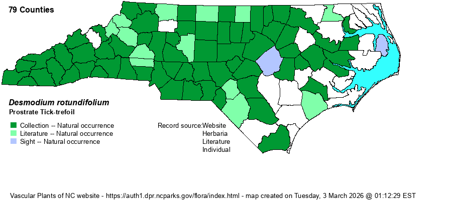 | Identification | This is possibly the easiest Desmodium to identify in the state, and most people have seen it frequently and can readily identify it. It has a trailing stem that can reach about 3 feet long, with dense hairs covering the stem. It is sparsely branched, with 3 completely distinctive rounded leaflets. Each leaflet averages about 2 inches across, is rotund (about the size of a silver dollar), and is densely hairy on both sides. At leaf nodes or at the end are scattered slender racemes, reaching about 6-9 inches tall, with scattered pink flowers that are fairly large for the genus, each about 2/5-inch long. Pods are not needed for identification, as the trailing, vine-like stem with 3 large and rounded leaflets cannot be confused. Even people who do not know or care much about identifying Desmodium species certainly know the name of this one, even if they call it "dollar-leaf". | |