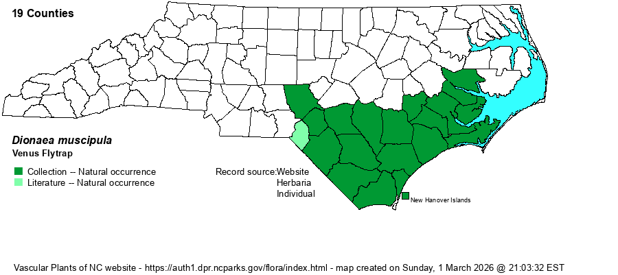 | Distribution | This species, which needs little or no introduction to people in NC, is found throughout the southern half of the Coastal Plain, but barely ranges into the Sandhills region. It ranges north to southern Beaufort County and formerly to Moore County, for a total of 18 counties. However, the NC NHP database considers the species to be extant now in 15 of them (historical in Moore, Lenoir, and Robeson counties). In 2023, several photos of the species were taken by Jeff Beane in Sandhills Game Land in Scotland County, the plant(s) was apparently transplanted there from an unknown source population.