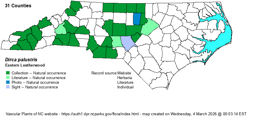 | Other Common Name(s) | Leatherwood, Ropebark, Wicopy, Leatherbark. Most older references call it simply as Leatherwood, but newer ones prefer to add a modifier to distinguish it from the other three named Dirca species in the Western states. Nonetheless, as this is the only one in NC, it is certainly fine to simply call it “Leatherwood” in species reports and general accounts. | |