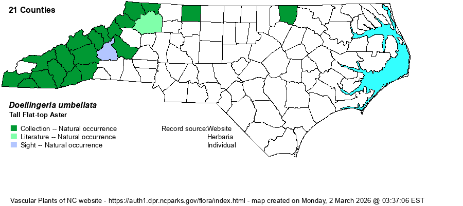 | Identification | Stems usually grow 4-7 (-8) feet tall, with many lance-ovate leaves that are 6-15 cm long (vs. 4-11 cm long in D. sericocarpoides). Note the different habitats and montane range. As with our other two Doellingeria species, rays are white and disks yellow (turning brown). A plant in bloom with its numerous and large white flowers and flat-topped (or dome-topped) inflorescence is quite striking. | |