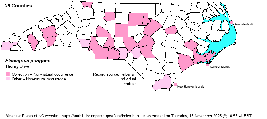 | Habitat | Roadside thickets, disturbed woods, maritime dunes, bottomlands, alluvial woods, tidal swamp forest (Onslow Co.). Extensively planted as a privacy hedge in recent decades. Normally not a problem species, as far as escaping into natural habitats. |