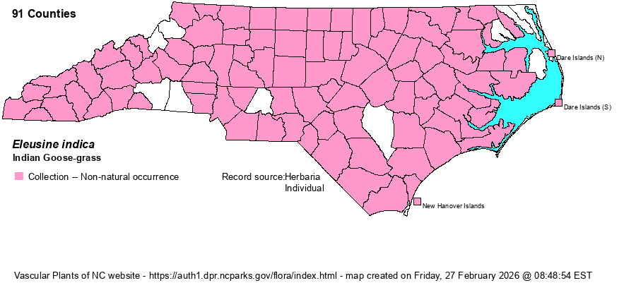 | Identification | Indian Goose-grass is one of those weedy grasses with a handlike or windmill-like inflorescence (digitate). There may be 4-10 "fingers" at the tip of the stem, sometimes a single one well below. The fingers are held somewhat erect, sometimes rather horizontal. From Dactyloctenium it differs in its blunt tip to each "finger" (vs. taper-pointed). | |
