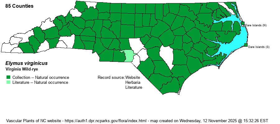 | Taxonomic Comments | Elymus glabriflorus and E. macgregorii have been split off; see FNA for treatments. Weakley (2020) recognizes E. hirsutiglumis, a single 1957 NC specimen from Robeson County. It previously had been treated as a variety or even a forma of virginicus and we believe it is merely a minor variant.