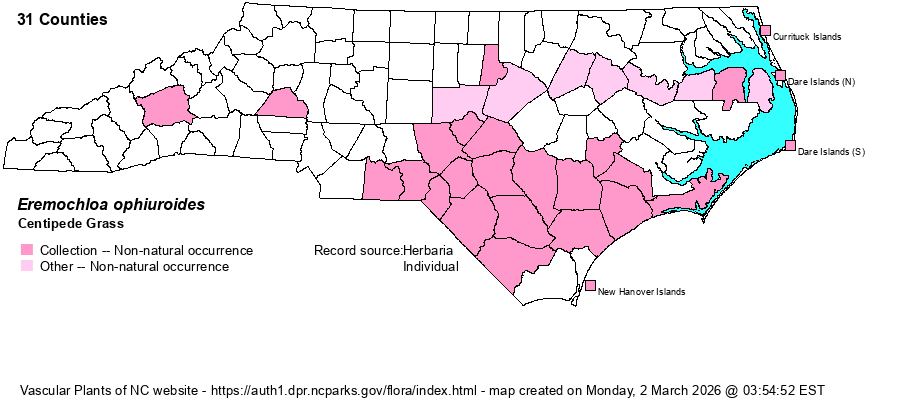 | Habitat | Roadsides and median strips, lawns, campuses; almost always where mown. This species was introduced to NC as a lawn grass in the 1930s-40s. | |