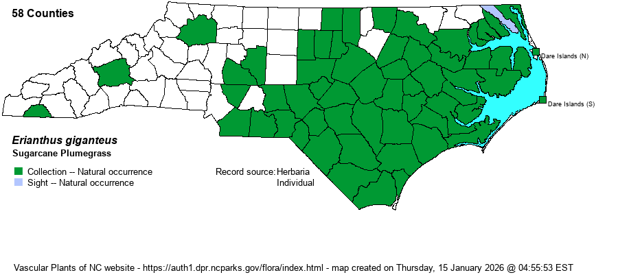 | Taxonomic Comments | Note that FNA and some other texts place plumegrasses in the genus Saccharum -- in this species thus named as S. giganteum. They are certainly closely similar, but the most recent molecular phylogeny splits them.