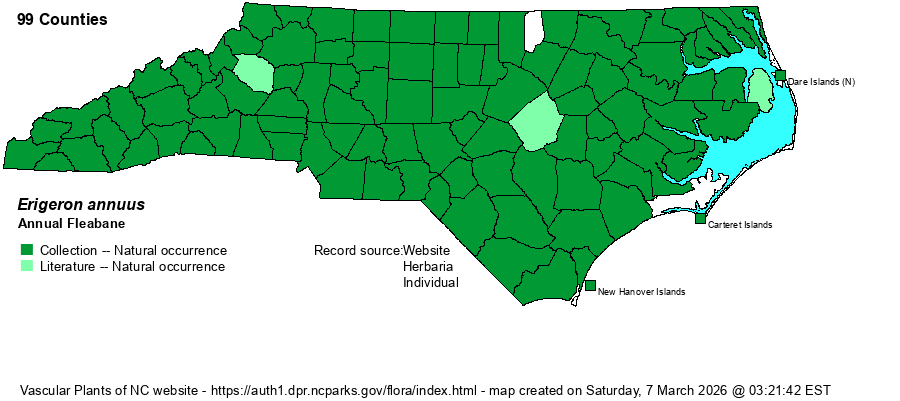 | Habitat | Mesic to moist or dry, rather fertile, soils of meadows, fields, cropfields, roadsides, waste places, vacant lots, yards, and gardens. These habitats are very similar to the equally numerous Prairie Fleabane (E. strigosus). The original natural habitats in NC are not known. | |