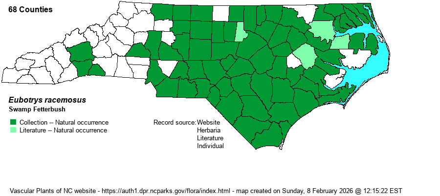 | Eubotrys racemosus | = | Eubotrys racemosa | Gleason and Cronquist (1991) | , orthographic (gender) variant | | Eubotrys racemosus | = | Eubotrys racemosa | Flora of North America (1993b, 1997, 2000, 2002a, 2002b, 2003a, 2004b, 2005, 2006a, 2006b, 2006c, 2007a, 2009, 2010) | , orthographic (gender) variant | | Eubotrys racemosus | = | Eubotrys racemosa | Gleason (1952) | , orthographic (gender) variant | | Eubotrys racemosus | = | Eubotrys racemosa | | , orthographic (gender) variant | | Eubotrys racemosus | = | Eubotrys racemosa | Flora of Virginia | , orthographic (gender) variant | | Eubotrys racemosus | = | Eubotrys racemosa | Wunderlin & Hansen Flora of Florida (3) | , orthographic (gender) variant | | Eubotrys racemosus | = | Leucothoe racemosa | Godfrey and Wooten (1979, 1981) | | | Eubotrys racemosus | = | Leucothoe racemosa | Kartesz (1999) | | | Eubotrys racemosus | = | Leucothoe racemosa | | | | Eubotrys racemosus | = | Leucothoe racemosa | | | | Eubotrys racemosus | = | Leucothoe racemosa | Radford, Ahles, and Bell (1968) | | | Eubotrys racemosus | = | Leucothoe racemosa | Wofford (1989) | | | Eubotrys racemosus | > | Leucothoe racemosa var. projecta | Fernald (1950) | | | Eubotrys racemosus | > | Leucothoe racemosa var. racemosa | Fernald (1950) | | | Eubotrys racemosus | > | Eubotrys racemosa | Small (1933, 1938) | | | Eubotrys racemosus | > | Eubotrys elongata | Small (1933, 1938) | | | Source: Weakley's Flora |