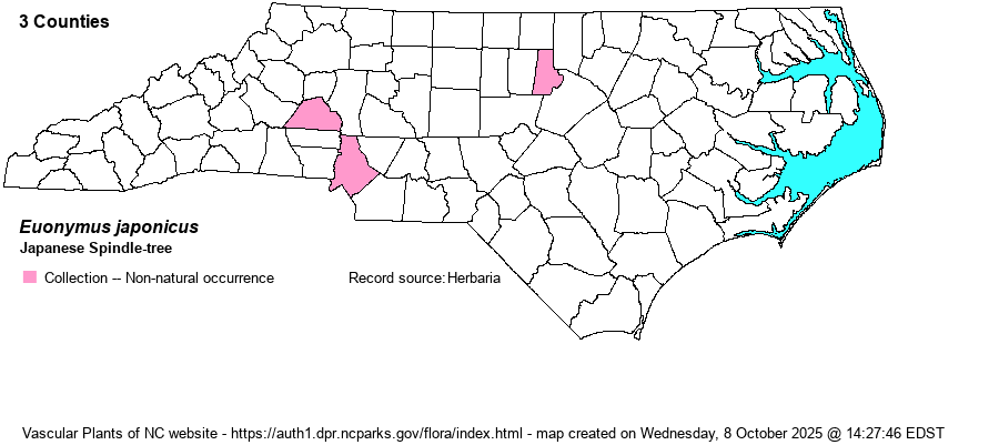 Distribution | There are reports and specimens from across the state, but only collections from Durham and Mecklenburg counties are from non-cultivated plants. Without images and label data, some specimens had to be eliminated here. A specimen from Catawba County (herbarium NCU) has large, open panicles and elliptical leaves with a driptip; it needs ID verification.