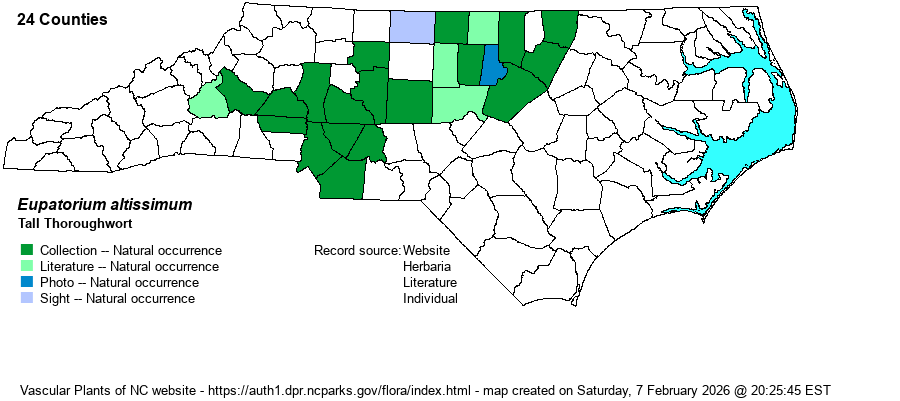 | Eupatorium altissimum | < | Eupatorium altissimum | Gleason and Cronquist (1991) | | | Eupatorium altissimum | < | Eupatorium altissimum | Flora of North America (1993b, 1997, 2000, 2002a, 2002b, 2003a, 2004b, 2005, 2006a, 2006b, 2006c, 2007a, 2009, 2010) | | | Eupatorium altissimum | < | Eupatorium altissimum | Kartesz (1999) | | | Eupatorium altissimum | < | Eupatorium altissimum | Vascular Flora of the Southeastern States (Cronquist 1980, Isely 1990) | | | Eupatorium altissimum | < | Eupatorium altissimum | | | | Source: Weakley's Flora |