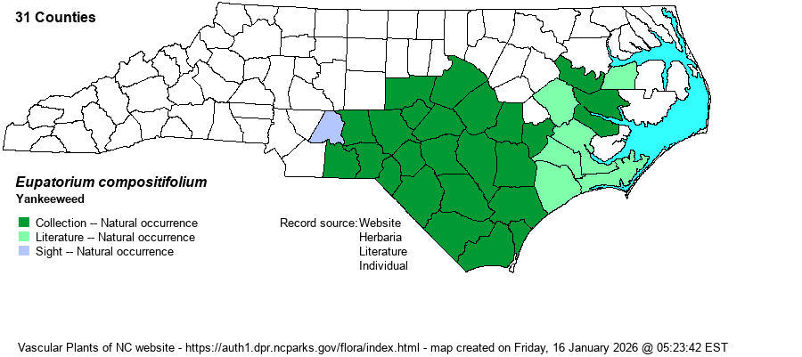 | Identification | This and E. capillifolium are our tallest eupatoriums (to 6.5 feet), with many strongly ascending branches bearing abundant tiny florets. Leaves of Yankeeweed are abundant and may be opposite or alternate, dissected into linear segments. Dog-fennel differs in its threadlike leaf segments less than 1 mm wide (vs. 1-2.5 mm wide in Yankeeweed). Both may occur near each other in the Coastal Plain, with Yankeeweed typically in the sandier places. | |