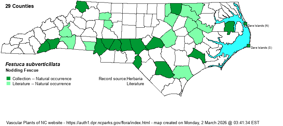| Identification | These plants grow up to 3 feet tall, with a sparse (few branches), very open inflorescence with 2-5 spikelets loosely clustered at the branch ends. The branches, and sometimes the whole inflorescence, arch outward and downward. It grows in some of the same habitats as F. paradoxa, but differs in the fewer-flowered, looser inflorescence. Its field gestalt is similar to that of Poa cuspidata, which may grow with it but differs in lemmas with obvious dorsal keel or low ridge (vs. no keel) and spikelets with hairs at the base (vs. no hairs). | |