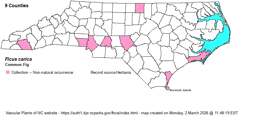 | Distribution | Scattered across the state, with big gaps. Specimens from Craven, Harnett, Henderson, and Orange counties are from cultivated plants.