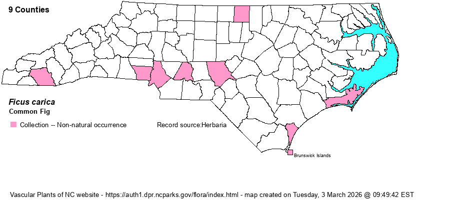 | Identification | Common Fig is widely grown in NC backyards, yet it rarely escapes. It is a small tree or spindly shrub up to 15 feet or so, with thick but weak stems and branches. Leaves are well-spaced, large, 3-5 lobed (sometimes none) like a glove, margins irregularly toothed. Flowers grow tight to leaf axils, with 2-6 sepals. Fruits are pear-shaped and many-seeded. | |