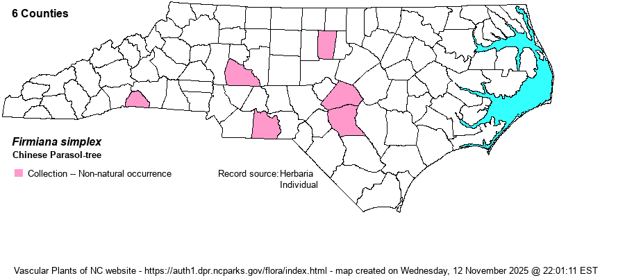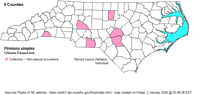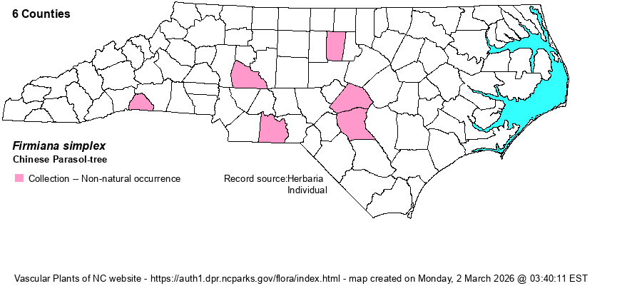 | Identification | Chinese Parasol-tree may grow to be a tree 60 feet tall. Young bark is green with pale streaks, later becoming gray. The leaves are broader than long (or about the same), shallowly cut into 3 lobes (or with 2 more small lobes), and may exceed 2 feet long and wide. The flowers occur on large open panicles; sepals 5, petals apparently absent. The fruits are lance-shaped or narrowly ovate. | |