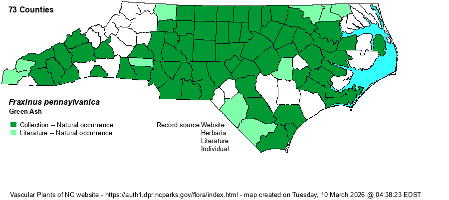 | Abundance | Common in the eastern and central Piedmont and in the Coastal Plain except for the eastern counties. Uncommon in the lower Mountains, mainly below 2500 feet elevation; rare to absent in counties bordering Albemarle and Pamlico sounds. Can be infrequent in some Coastal Plain counties that lack brownwater rivers. Sadly, the emerald ash borer strongly attacks this species, and in the northern border counties of the mountains and Piedmont considerable death of trees, or at least death of branches, has been noted since about 2010. Thus, strongly declining now, and the NCNHP moved the State Rank up to S4 (from S5) and added it to its Watch List as W5 -- strongly declining. NatureServe also recently moved the Global Rank from G5 to now G4. | |
