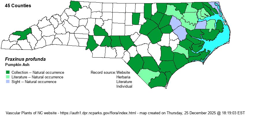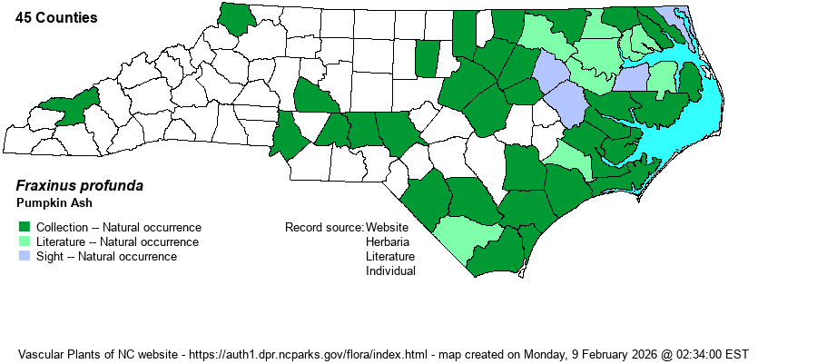 | Abundance | Generally uncommon to locally fairly common in the Coastal Plain, but is mysteriously rare to absent from some swampy regions where it ought to be present. Much less numerous than Carolina (F. caroliniana) and Green (F. pennsylvanica) ashes in wetlands in this province. Rare and local in the eastern Piedmont, and absent to very rare in the western half of the state. Though declines due to emerald ash borer have perhaps not been noted in this species yet, the NCNHP moved the State Rank from S4 to now S3S4 and placed it on its Watch List as W5 -- strongly declining. | |