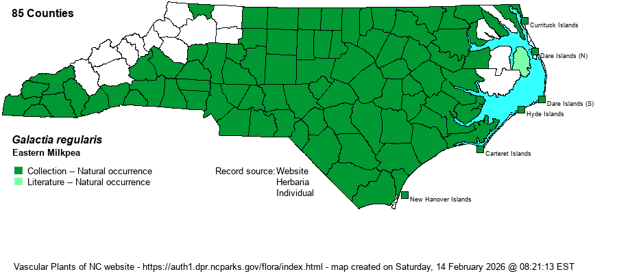 | Other Common Name(s) | Confusing, owing to the recent swapping of names. Some name this as Downy Milkpea or Hairy Milkpea. However, with the swapping of scientific names between G. regularis and G. volubilis, the use of names such as Downy and Hairy become muddled, as these have also been used for the latter. As this is the only Galactia with a broad Eastern range, the use of Eastern Milkpea should end confusion. | |