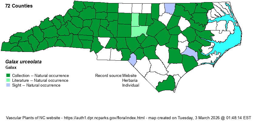 | Taxonomic Comments | Formerly named as Galax aphylla, but universally known now as G. urceolata. The species is monotypic – the only species in its genus.