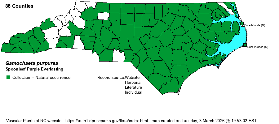 | Identification | The original Spoonleaf Purple Everlasting has been split into several species, some native and some alien; see the key in Weakley (2024). As now understood, this species occurs in a number of natural habitats, as well as ruderal ones, whereas the segregates -- most native to NC and the U.S. -- occur almost entirely in ruderal and disturbed habitats. Spoonleaf Purple Everlasting belongs to the group that has bicolored leaves: the upper surface is green while the underside is whitened with dense hairs. Note that some plants will have basal and lower leaves essentially green above and stem leaves practically whitened on both surfaces; these will not key cleanly. The species differs from G. argyrinea in its narrower leaves that are spatulate (vs. oblanceolate or obovate) and taller involucres (4-4.5 mm long vs. 3-3.5 mm long). | |