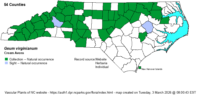 | Identification | This is a species reasonably similar to G. canadense, the one that biologists are more familiar; it grows to about 2 feet tall but it generally more stout. The stem is quite hairy. The basal leaves and stem leaves are somewhat larger than in G. canadense, but usually with fewer segments on the dissected leaves. The terminal leaflets are usually 3-lobed and much larger than all others. As with most in the genus, the leaves are reduced up the stem, and there is a branched inflorescence at the summit, with a single flower atop each branch. In this species, the 5 petals are creamy yellow to pale yellow, only about 1/8-inch long, and shorter than the sepals. Most of the flower consists of the green receptacle, and thus the pale yellow petals are barely visible at 10 or more feet away. Other Geum species have either white or bright yellow petals. Also, when in bloom, it can resemble several buttercup (Ranunculus) species, so be careful that you have the correct family and genus; Geum species tend to have very hispid stems and often hispid leaves, and basal leaves tend to be somewhat pinnately divided. This is a species that is normally seen just in leaf, and with others in the genus, take extreme caution when attempting to identify any just with vegetative characters. | |