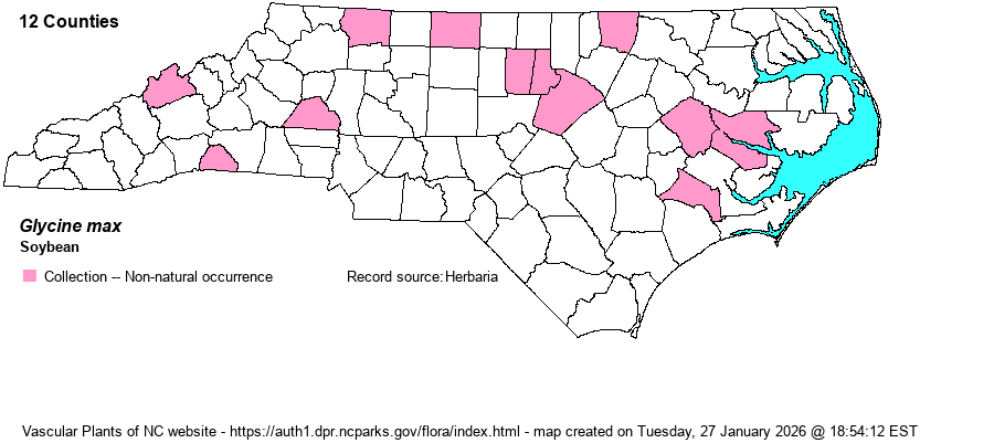 | Identification | Soybean is a very familiar crop grown in large acreage in NC. It is an upright plant 12-18 inches tall. The leaves are divided into 3 ovate leaflets. The flowers are inconspicuous, 3-8 in axils of leafstalks. Fruits droop, tan to dusky color, in narrow pods of often 3 segments. | |