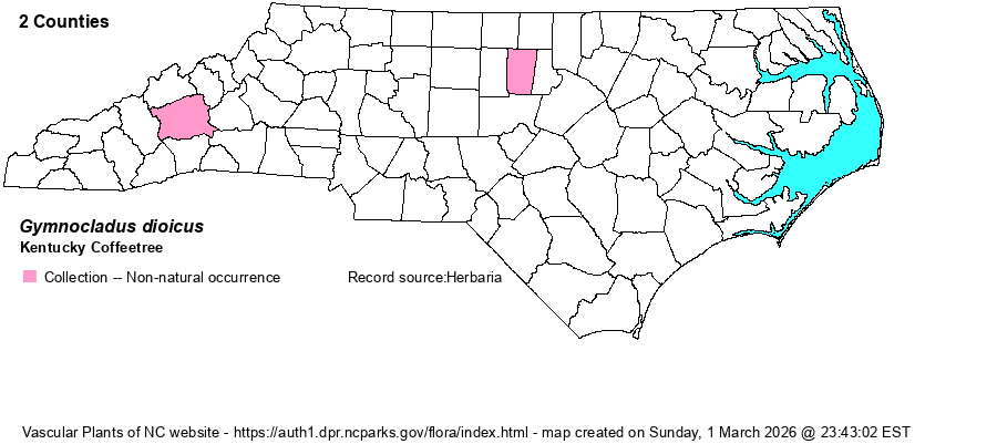 | Account for Kentucky Coffeetree - Gymnocladus dioicus (L.) K. Koch | Only member of Gymnocladus in NC. | |||||||||
