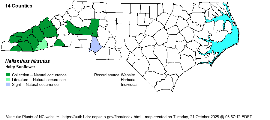 Identification | Plants typically grow 2-5 (-6) feet tall from long rhizomes, the stems coarsely hairy throughout. Leaves are opposite, short-stalked, lance-shaped to ovate, up to 6 inches long and 3 inches wide, coarsely hairy on both sides (may be scabrous above). Rays and disks are yellow. Together, the long rhizomes (greater than 4 inches) and long hairy stems and leaves should clinch identification. The non-native (in NC) Ashy Sunflower (H. mollis) has soft-hairy leaves. | |