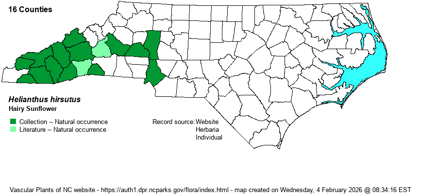 | Identification | Plants typically grow 2-5 (-6) feet tall from long rhizomes, the stems coarsely hairy throughout. Leaves are opposite, short-stalked, lance-shaped to ovate, up to 6 inches long and 3 inches wide, coarsely hairy on both sides (may be scabrous above). Rays and disks are yellow. Together, the long rhizomes (greater than 4 inches) and long hairy stems and leaves should clinch identification. The non-native (in NC) Ashy Sunflower (H. mollis) has soft-hairy leaves. At first glance, this species looks like the much more common H. divaricatus, but that species has a smooth stem as opposed to a clearly hairy stem. | |