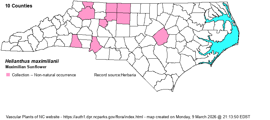 | Helianthus maximilianii | = | Helianthus maximiliani | Fernald (1950) | , orthographic variant | | Helianthus maximilianii | = | Helianthus maximiliani | Flora of North America (1993b, 1997, 2000, 2002a, 2002b, 2003a, 2004b, 2005, 2006a, 2006b, 2006c, 2007a, 2009, 2010) | , orthographic variant | | Helianthus maximilianii | = | Helianthus maximiliani | Gleason (1952) | , orthographic variant | | Helianthus maximilianii | = | Helianthus maximiliani | | , orthographic variant | | Helianthus maximilianii | = | Helianthus maximiliani | | , orthographic variant | | Helianthus maximilianii | = | Helianthus maximiliani | | , orthographic variant | | Helianthus maximilianii | = | Helianthus maximiliani | Radford, Ahles, and Bell (1968) | , orthographic variant | | Helianthus maximilianii | = | Helianthus maximiliani | Small (1933, 1938) | , orthographic variant | | Helianthus maximilianii | = | Helianthus maximiliani | Flora of Virginia | , orthographic variant | | Source: Weakley's Flora |