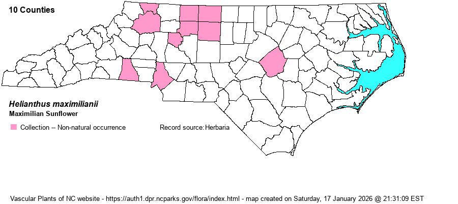 | Helianthus maximilianii | = | Helianthus maximiliani | Fernald (1950) | , orthographic variant | | Helianthus maximilianii | = | Helianthus maximiliani | Flora of North America (1993b, 1997, 2000, 2002a, 2002b, 2003a, 2004b, 2005, 2006a, 2006b, 2006c, 2007a, 2009, 2010) | , orthographic variant | | Helianthus maximilianii | = | Helianthus maximiliani | Gleason (1952) | , orthographic variant | | Helianthus maximilianii | = | Helianthus maximiliani | | , orthographic variant | | Helianthus maximilianii | = | Helianthus maximiliani | | , orthographic variant | | Helianthus maximilianii | = | Helianthus maximiliani | | , orthographic variant | | Helianthus maximilianii | = | Helianthus maximiliani | Radford, Ahles, and Bell (1968) | , orthographic variant | | Helianthus maximilianii | = | Helianthus maximiliani | Small (1933, 1938) | , orthographic variant | | Helianthus maximilianii | = | Helianthus maximiliani | Flora of Virginia | , orthographic variant | | Source: Weakley's Flora |