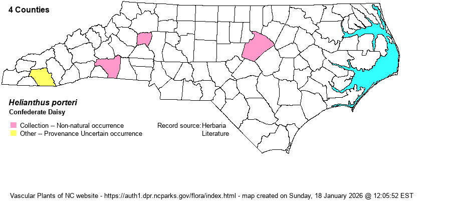 | Distribution | Collected from just 3 sites, all at granitic flatrocks/outcrops: Alexander County, stone quarry at Rocky Face Mountain, 1968-1983; Rutherford County, granitic flatrock (presumably at Sandymush Outcrop), 1988; and Wake County, granitic flatrock at Mitchells Mill SP, 1988-1990. At the last, it was introduced in the 1960s; see Weakley (2018) for information. The label for the Rutherford specimen says "apparently a (deliberate?) recent introduction". In 2024, a large population was discovered in Macon County; photos documented this record. However, one botanist said there are other botanists who are aware of this population and suspect it may be introduced or may have assumed that it is introduced. For now, as the species is native within about 20 miles southward in SC, the website editors will consider this Macon record as Provenance Uncertain.