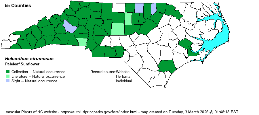| Distribution | Mountains and most of the Piedmont; scarce in the southeastern Piedmont, and disjunct to two counties on the outer Coastal Plain. A number of photos on iNaturalist for "white" counties in the Piedmont may well be correct, but identification of sunflowers from photos is extremely difficult.