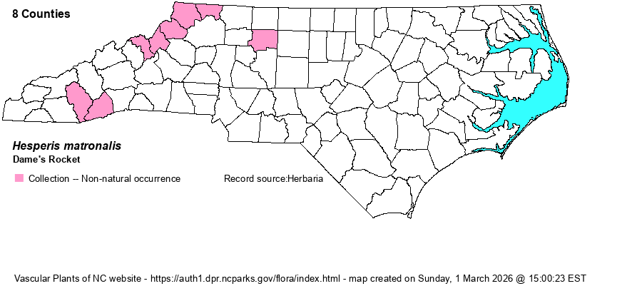 | Distribution | Mountains, plus Forsyth County in Piedmont. Other SERNEC specimens from Iredell, Jackson, and Wake counties are misidentified and appear to be Raphanus sativum.
