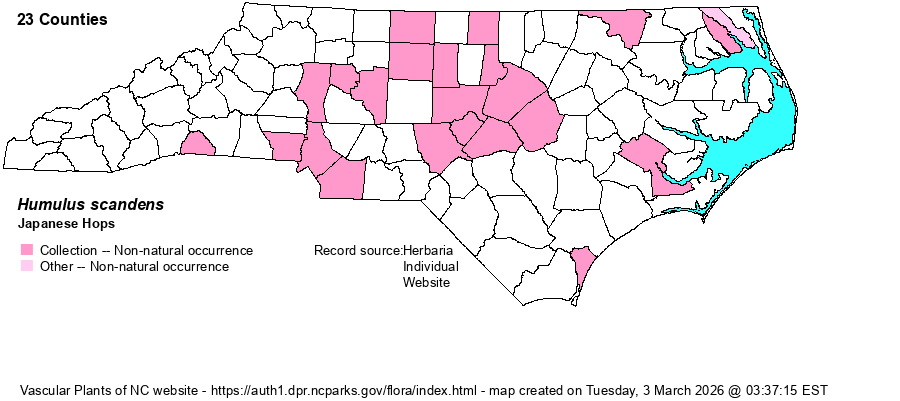 | Identification | Japanese Hops is a long-creeping or scrambling vine that forms rather monospecific patches. Individual stems reach 9 feet long or so, much-branched, and very prickly-haired. Leaves are large and alternate, well-spaced, palmate into 3 broad segments plus 2 or more narrower lobes, margins serrate. Inflorescences are male or female, in leaf axils or terminal, males in open panicles, females in spikes. It is told from H. pubescens by the prickly hairs on the leaf undersides (vs. none) and more leaf lobes (5-9 lobes vs. 1-3 lobes in H. pubescens). | |