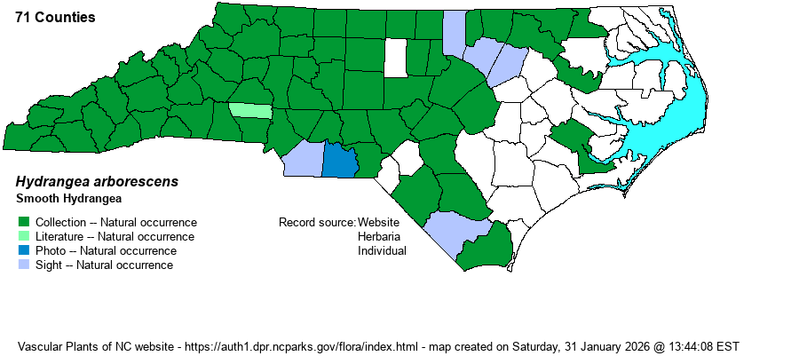 | Taxonomic Comments | There are no issues with the species, but several other Hydrangea taxa were formerly included within H. arborescens. RAB (1968) and many others included the current Hydrangea cinerea as H. arboresecens ssp. discolor, and the current H. radiata as H. arborescens ssp. radiata. Most recent treatments have these taxa as separate species.