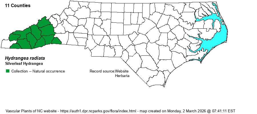 | Distribution | This species, as with Hydrangea cinerea, is limited in the state to the southwestern portions. It occurs in the Mountains north only to Madison County and to Polk County on the east. It likely is not found into the Piedmont foothills.
